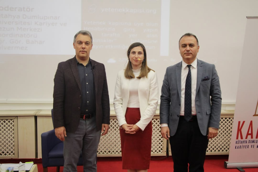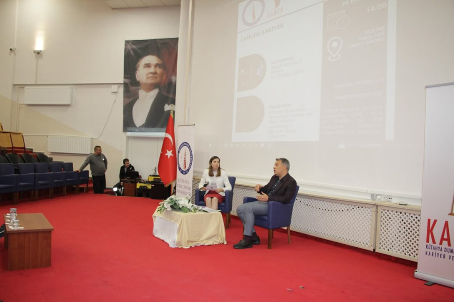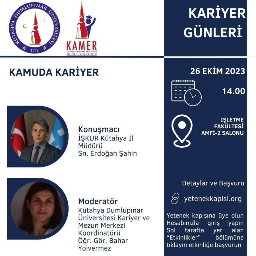 Kütahya Dumlupınar Üniversitesi Kariyer ve Mezun Merkezi olarak Kariyer Günleri kapsamında düzenlediğimiz konuşmacı olarak İŞKUR Kütahya İl Müdürü Sn. Erdoğan Şahin'in katıldığı “Kamuda Kariyer“ başlıklı seminerimizi 26 Ekim Perşembe Günü 14.00'da İşletme Amfi-2 Salonunda gerçekleştirdik. Seminerimizde, Sn. Erdoğan Şahin kamu sektöründeki kariyer olanakları, sektörün kolay ve zor yanları, İŞKUR'un kamu sektöründeki rolü ve öğrencilerin iş hayatında karşılaşabilecekleri sorunlara ilişkin anlatımlarda bulundu ve çözüm önerilerini öğrencilerimizle paylaştı. İŞKUR İş ve Meslek Danışmanlarımız tarafından KAMER ile işbirliği çerçevesinde gerçekleştirilecek olan İŞKUR Kampüs faaliyetleri ve İş Kulübü Eğitimleri hakkında bilgi verildi. Katılımları için İŞKUR Kütahya İl Müdürümüz Sn. Erdoğan Şahin'e, İŞKUR Ekibine ve Kütahya Dumlupınar Üniversitesi öğrencilerine teşekkür ederiz.