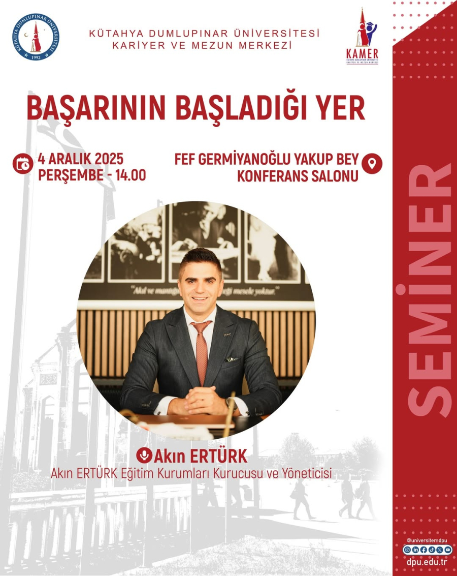 Mezunlarla Söyleşiler Etkinliklerimiz kapsamında düzenlediğimiz konuşmacı olarak Akın Ertürk Eğitim Kurumları Kurucusu ve Yöneticisi Akın Ertürk'ün katıldığı "Başarının Başladığı Yer" başlıklı seminerimizi 04 Aralık Perşembe günü saat 14:00'te Fen Edebiyat Fakültesi Germiyanoğlu Yakup Bey Konferans Salonu’nda gerçekleştirdik.